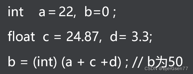{int a = 2, b = 3;float c = 3.14;int sum;sum = (int)(a + b + c);printf("%d\n", sum);return 0;