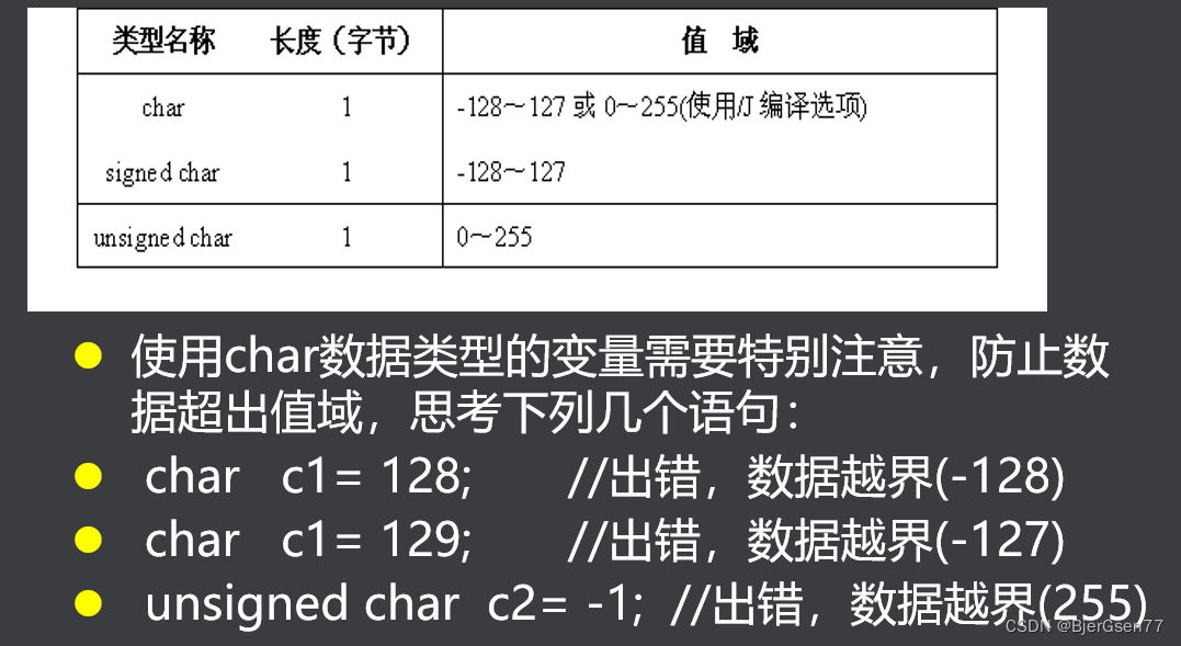 char unsigned char 1字节 00000000~11111111 0~255
