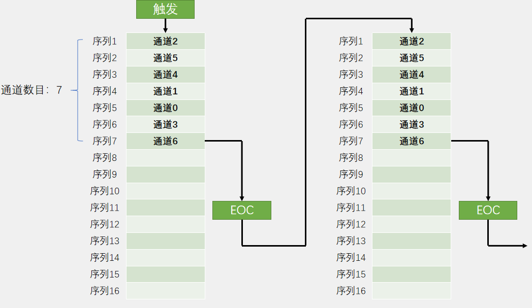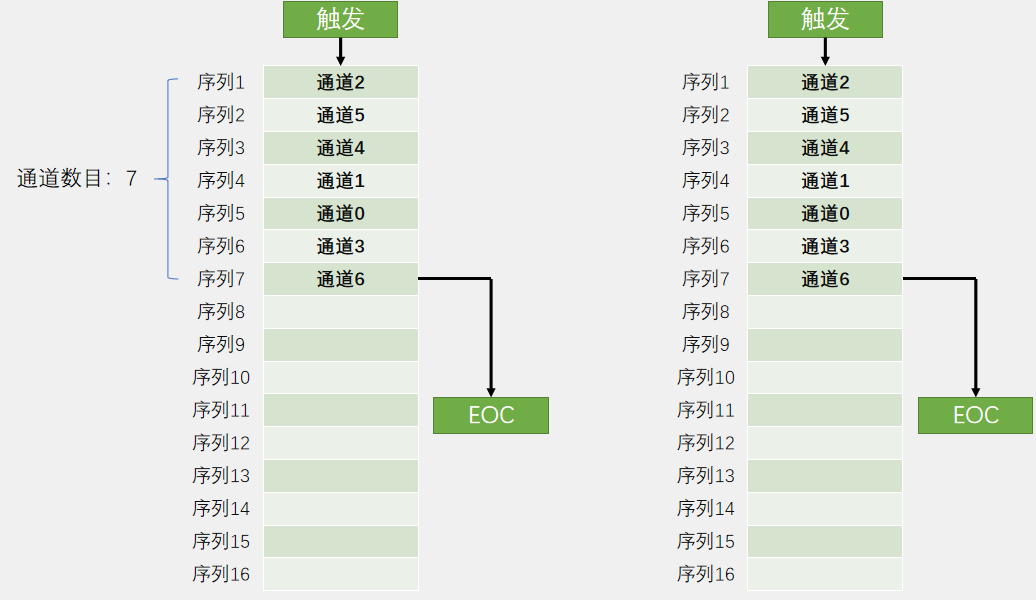 扫描模式:用到“菜单”模式,每个位置是通道几可以任意指定,并且也是可以重复的。转换的结果都放在数据寄存器中,为了防止数据被覆盖,需要用DMA及时将数据挪走,通道全部转换完成后,产生EOC信号,转换结束。