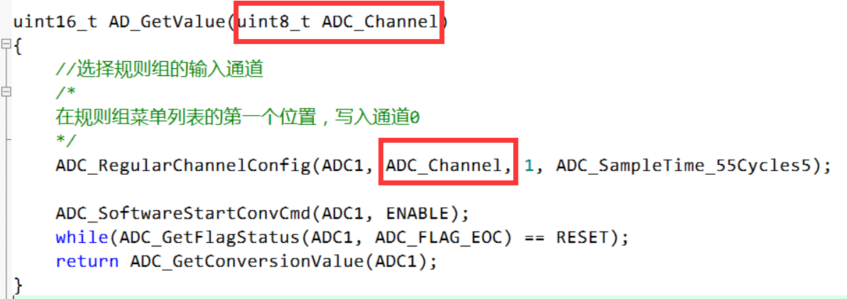 {ADC_SoftwareStartConvCmd(ADC1, ENABLE);while(ADC_GetFlagStatus(ADC1, ADC_FLAG_EOC) == RESET);return ADC_GetConversionValue(ADC1);