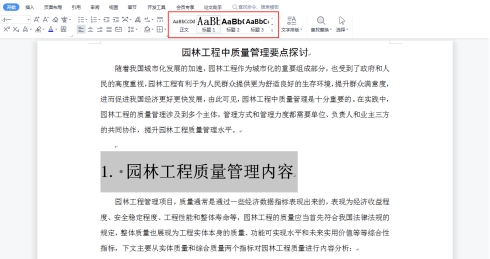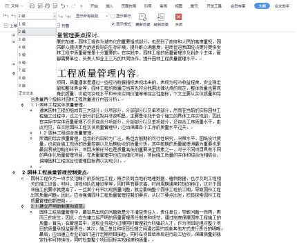 使用“Ctrl”键,选中“园林……内容”“园林……要点”,单击【引用】选项卡下【目录级别】下拉按钮,选择【1级目录】命令,如图2-157所示;选中“园林工程实体质量管理”“园林工程综合质量管理”“简历严明的制度和规范”,将其设置为“2级目录”。