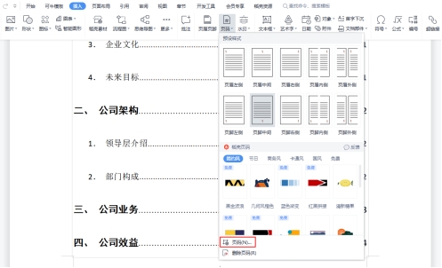 单击【插入】选项卡中的【页码】下拉按钮,在下拉面板中选择相应样式,如“页脚中间”,如图2-163所示。此时全文会应用所选样式。
