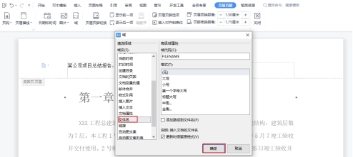 将光标置于奇数页页眉,打开【域】对话框,在【域名】栏中选择“文件名”,点击【确定】按钮,页眉会显示当前文章标题,如图2-172所示。