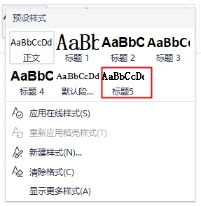 打开样式库的下拉面板,在下拉面板中选择【新建样式】命令,如图2-143所示,此时会弹出【新建样式】对话框,在对话框中设置名称为“标题5”,字体为“微软雅黑”,字号为“小四”,字形加粗,对齐为“两端对齐”,如图2-144所示,单击【确定】按钮后即可完成样式的新建,再次打开样式库下拉面板,就可看到新创建的样式,如图2-145所示。
