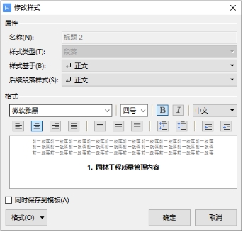 用户在给标题设置层级时,使用方法一,会发现所选中的文本的字体、字号等格式发生了变化,这其实是因为“标题1、标题2”等是WPS文字预设的一个样式,套用该样式WPS文字会自动对文本的格式进行修改。当预设的样式不能满足要求时,用户可以根据实际情况对样式进行修改,或新建一个自己所需的样式。