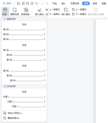 将鼠标光标定位在要插入目录的位置,单击【引用】选项卡中【目录】下拉按钮,在下拉列表中选择【智能目录】【自动目录】【自定义目录】命令,如图2-146所示,WPS文字便能为文档插入设置好级别的目录。