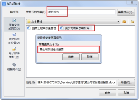 打开【插入超链接】对话框,在对话框左侧“链接到”工作栏中单击【原有文件或网页】命令。以链接文件为例,选中文件“某公司项目总结报告”,在对话框上方【要显示的文字】文本框中输入“项目报告”,单击【屏幕提示】按钮设置屏幕提示文字“某公司项目总结报告”,设置完成后,单击【确定】按钮,如图2-188所示,即可在文档中创建超链接。