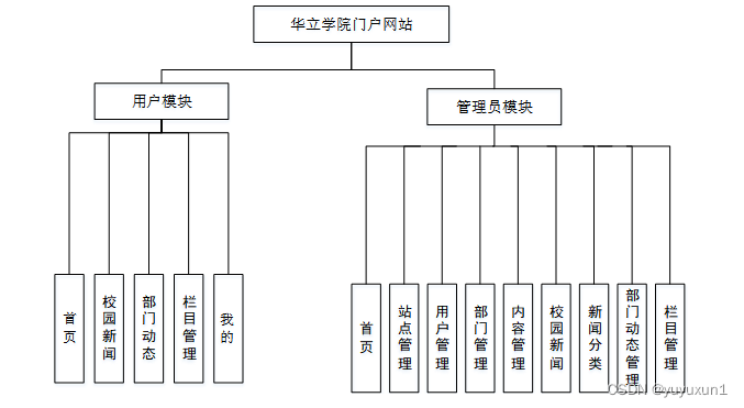 (3)确定好系统使用的技术,进行在线确认系统所划分的用户角色,并且根据用户角色划分确定所要设计的功能模块,对于华立学院门户网站的设计主要划分别为管理员和用户角色,并所使用的功能模块也相应不同,但是系统的数据库实现的内容是交互的,用户可以随时根据自己的需求进行课程信息,对于系统工作人员可以根据自己的分管内容进行在线信息的处理及操作,管理员获取到所有用户的详细数据信息,并根据需求进行第一时间处理解决。