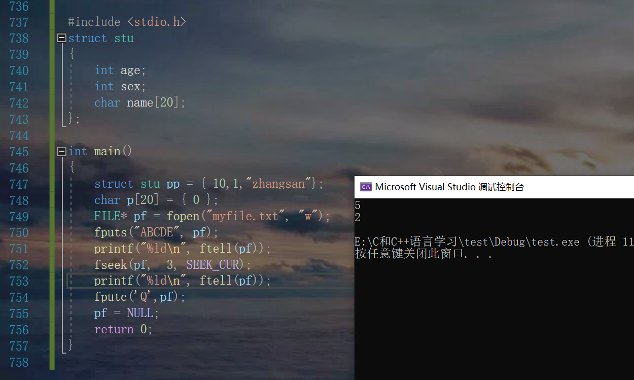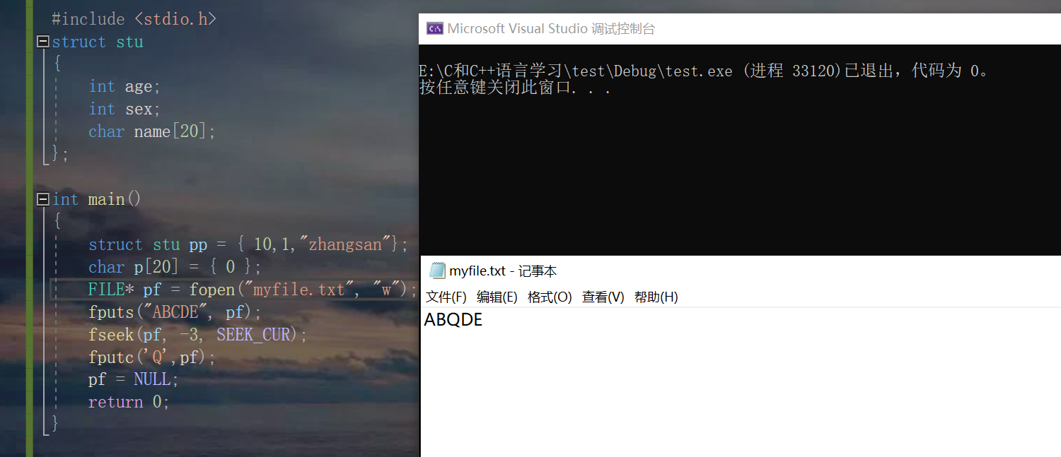 {struct stu pp = { 10,1,"zhangsan"};char p[20] = { 0 };FILE* pf = fopen("myfile.txt", "w");fputs("ABCDE", pf);printf("%ld\n", ftell(pf));fseek(pf, -3, SEEK_CUR);printf("%ld\n", ftell(pf));fputc('Q',pf);pf = NULL;return 0;