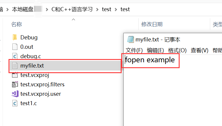 当我们ctrl + F5让代码运行起来的时候,我们到相应我文件路径下查看,发现确实多了一个文件myfile.txt,打开以后,发现其内容就是fopen example: