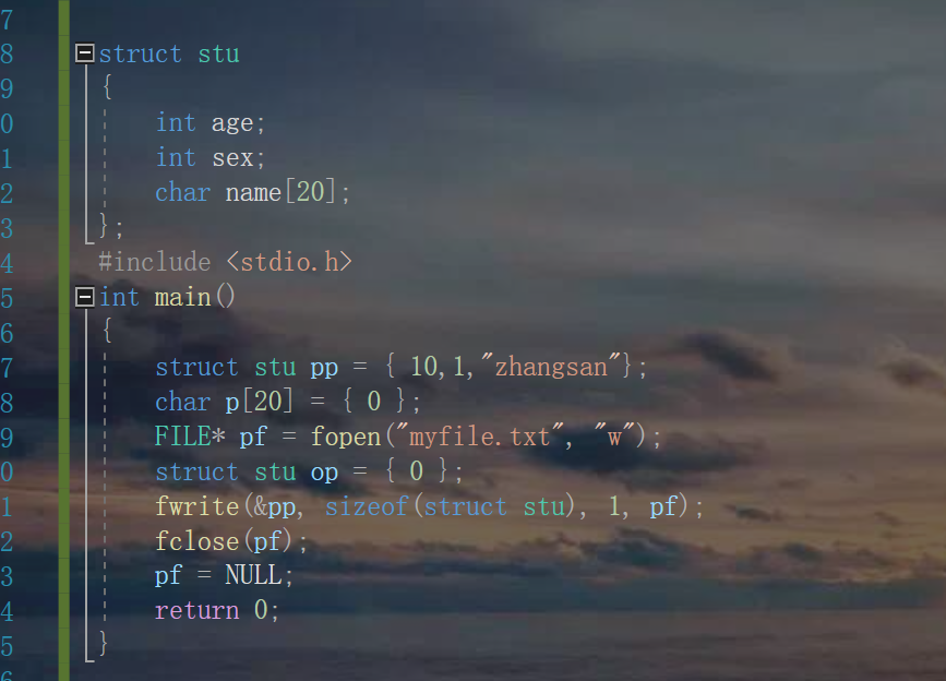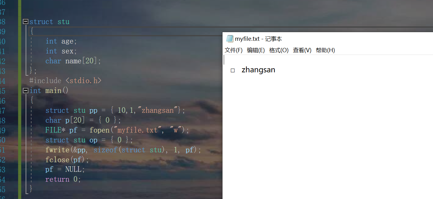 {struct stu pp = { 10,1,"zhangsan"};char p[20] = { 0 };FILE* pf = fopen("myfile.txt", "wb");struct stu op = { 0 };fwrite(&pp, sizeof(struct stu), 1, pf);fclose(pf);pf = NULL;return 0;
