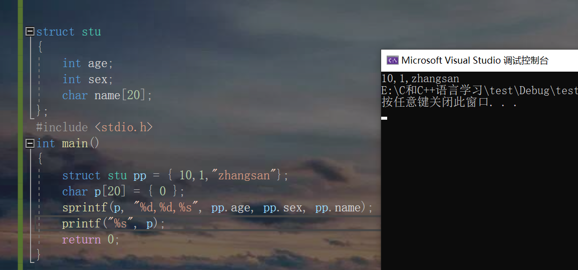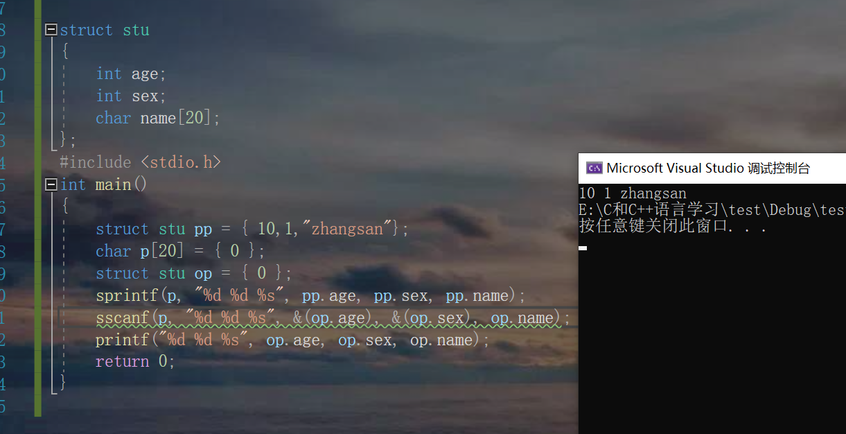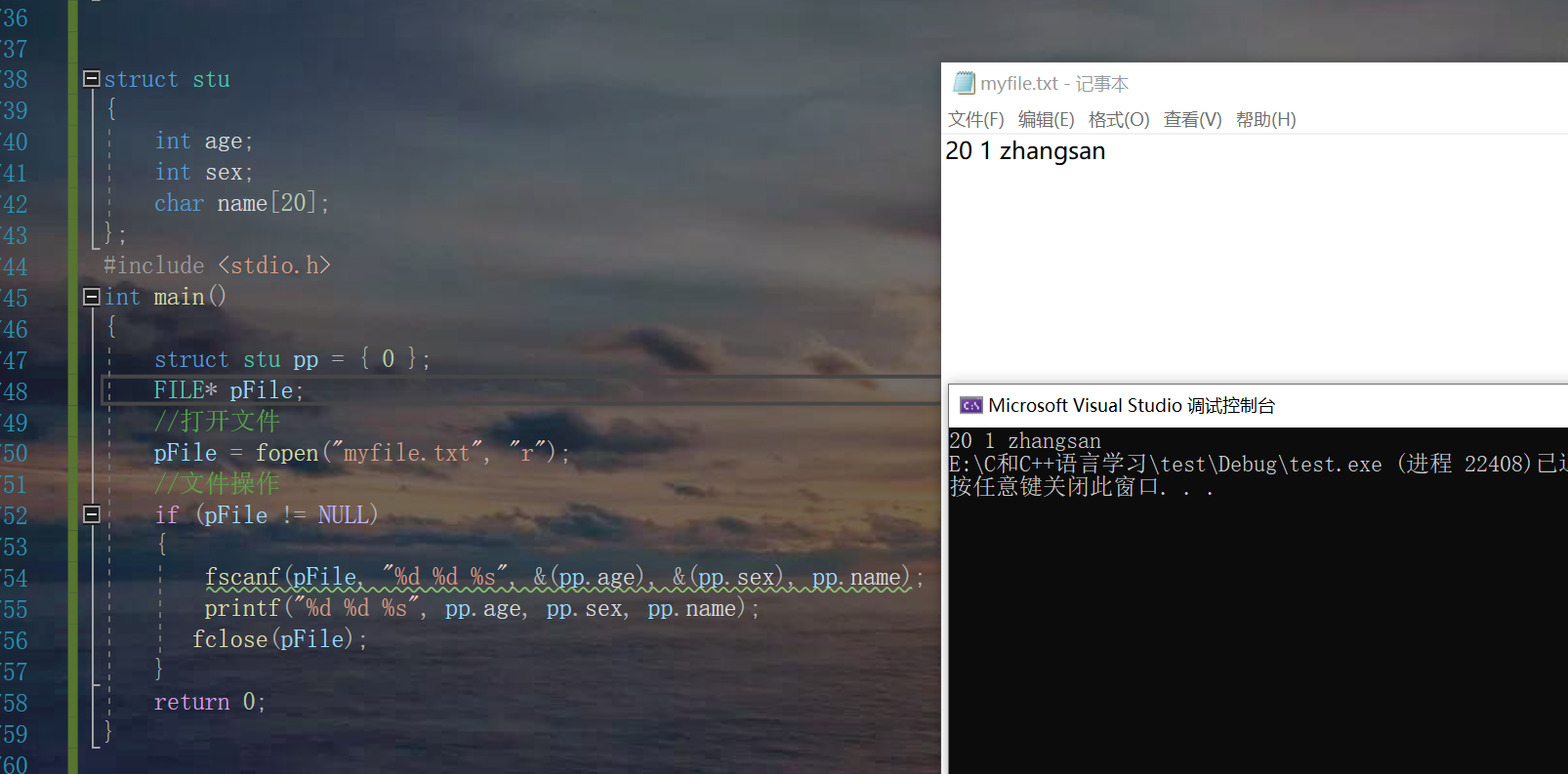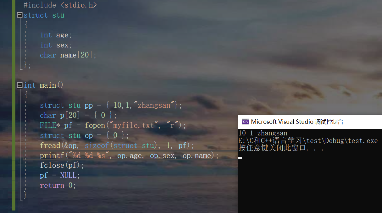 {struct stu pp = { 10,1,"zhangsan"};char p[20] = { 0 };FILE* pf = fopen("myfile.txt", "rb");struct stu op = { 0 };fread(&op, sizeof(struct stu), 1, pf);printf("%d %d %s", op.age, op.sex, op.name);fclose(pf);pf = NULL;return 0;