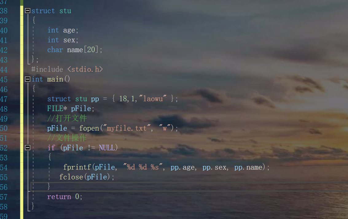 {struct stu pp = { 18,1,"laowu" };FILE* pFile;//打开文件pFile = fopen("myfile.txt", "w");//文件操作if (pFile != NULL){fprintf(pFile, "%d %d %s", pp.age, pp.sex, pp.name);fclose(pFile);}return 0;