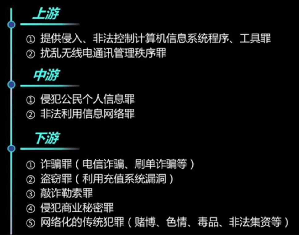 随着黑产技术门槛降低,团伙作案、分工细致越来越普遍化。与此同时,网络黑产逐渐形成上下游链条,物料、流量和支付成为犯罪作业中的三要素。物料即个人信息、平台账号及技术工具,流量即建立与受害者的联系,支付是指将赃款分散洗白。