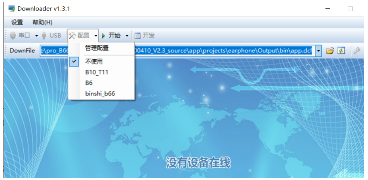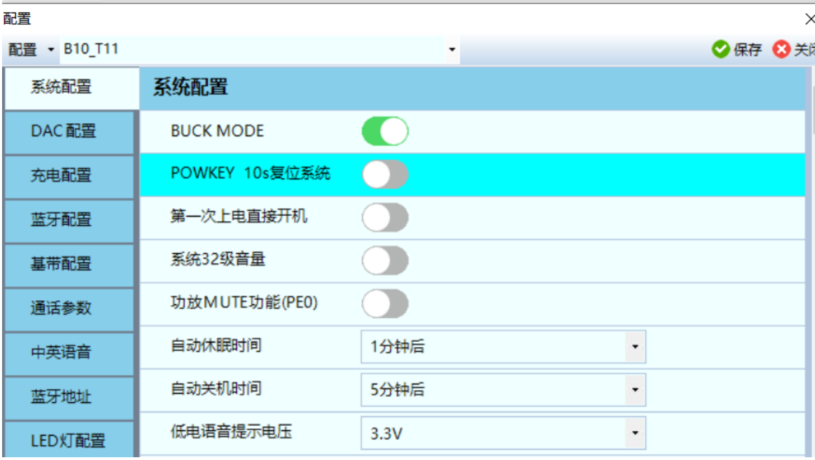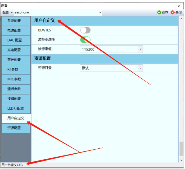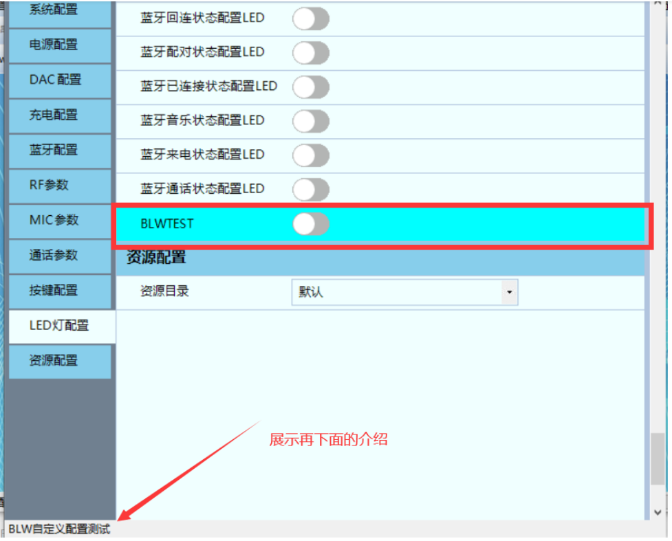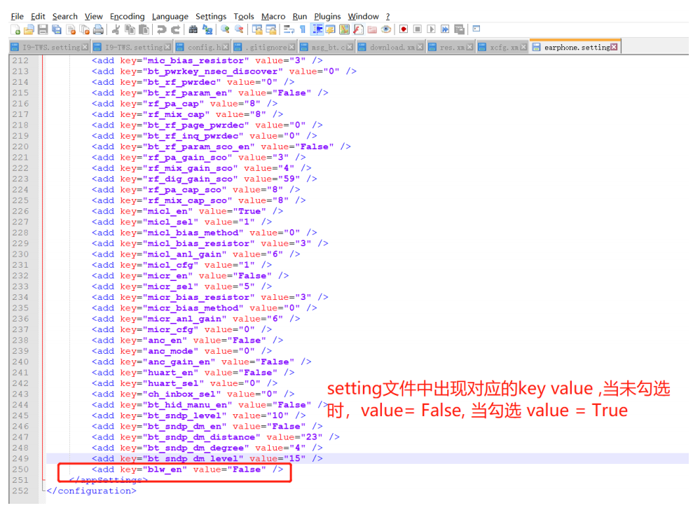 CHECK: 表示这个一个 CHECK 显示界面框 BLWTEST: 表示显示界面提示字符 "BLW自定义配置测试 ": 当鼠标在 BLWTEST 选项上时 , DownLoader 底部会显示这一串提示 字符. 0: 表示默认值 , 即没有选则配置文件时 , BLW_EN ( 也就是程序中的 xcfg_cb.blw_en) 值为 0. 在这个示例中 如果把 BLW_EN 从关闭改为打开 , 并保存 . 可以看到对应的 earphone.setting 文件中有如下变化