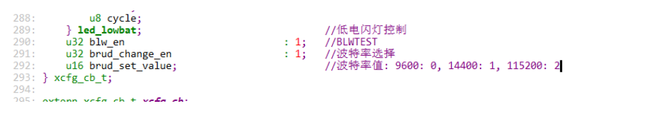 所以,xcfg.blw_en 此时我们就可以用此变量去实现我们自己需要的功能开关。 配置实例讲解2: (LISTVAL) 语法: config(CHECK,"波特率选择","波特率开关",BRUD_CHANGE_EN,1) 2 config(LISTVAL, "波特率值","设置波特率",BRUD_SET_VALUE,SHORT,2,3, ("9600",0),("14400",1),("115200",2),BRUD_CHANGE_EN);
