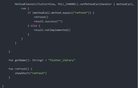 当 Flutter 调用 refresh 方法时,android 端调用 refresh() 方法,这里实现了一个简单的吐司,并返回了空字符串。