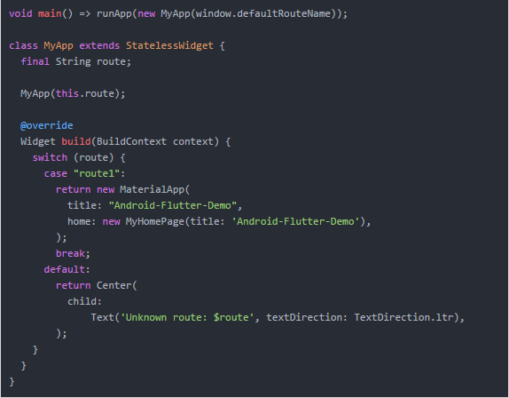 4、我们知道在 Flutter 中,主入口只有一个 void main(),如果在原生界面 A,要显示一个 ListView。在原生界面 B,要显示一个 webView。那我们在 Flutter 中,通过什么来判断我要加载的是 ListView 还是 webView 呢?