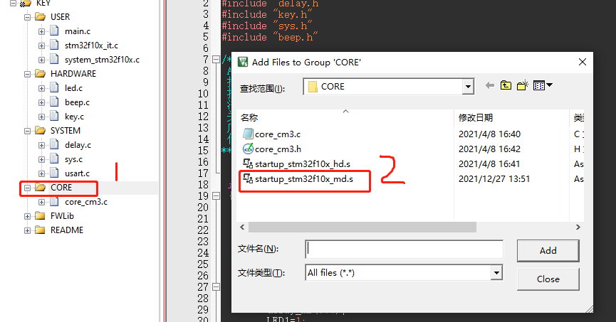 1、更换启动文件,双击工程中的CORE,选择_MD.S的启动文件。MD的意思时中等容量FLASH,C8T6是128K,算是中等容量。