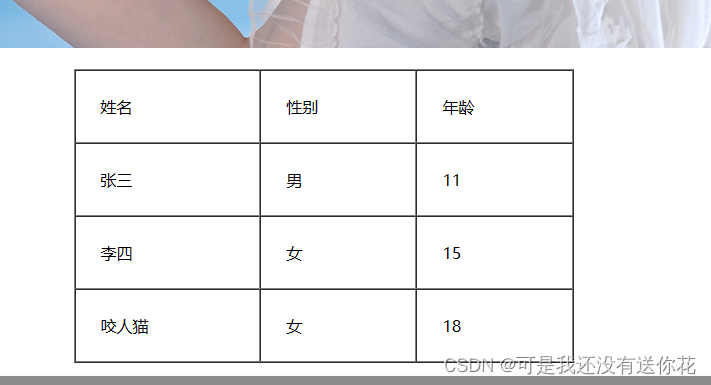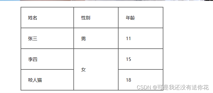 姓名 性别 年龄 张三 男 11 李四 女 15 咬人猫 女 18