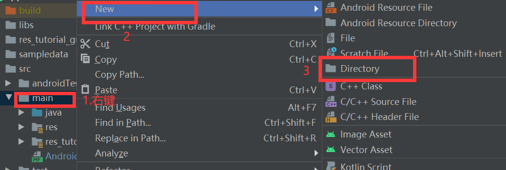 1、在src->main根目录下右键,然后new,找到Directory