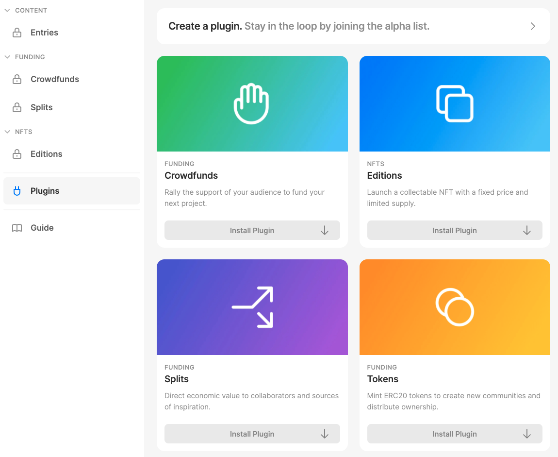事实上,Mirror 团队也越来越认识到这一点,原来 Blocks 里的 Crowdfunds、Editions 和 Splits 等功能全部迁移到新功能「Plugins 模块」,Jon-Kyle 表示「可组合性是 Web3.0 的核心原则,能够让 Web3.0 时代的社区构建工具在 Mirror 生态共存且互相组合运用,我们感到非常的兴奋。」