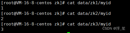 mkdir -p logs/zk1 logs/zk2 logs/zk3 每个节点创建 myid 文件并分别填写1、2、3