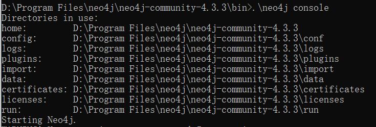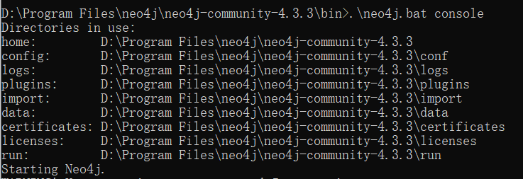 (2)使用 .\neo4j console 或者 .\neo4j.bat console 将 neo4j 作为控制台应用程序运行;