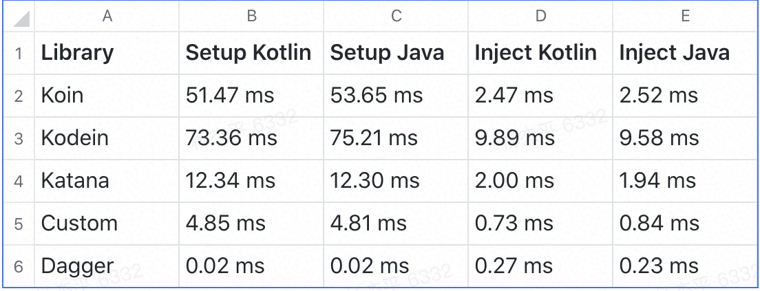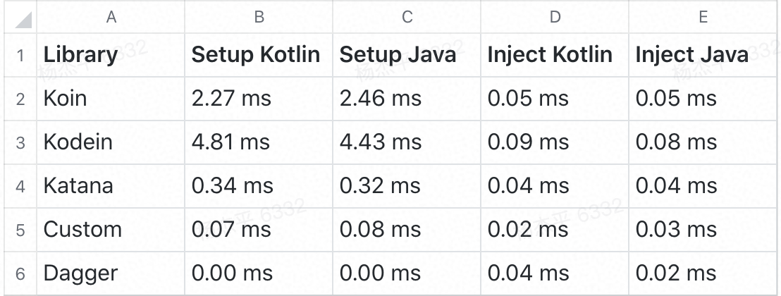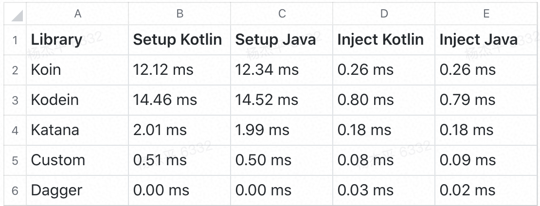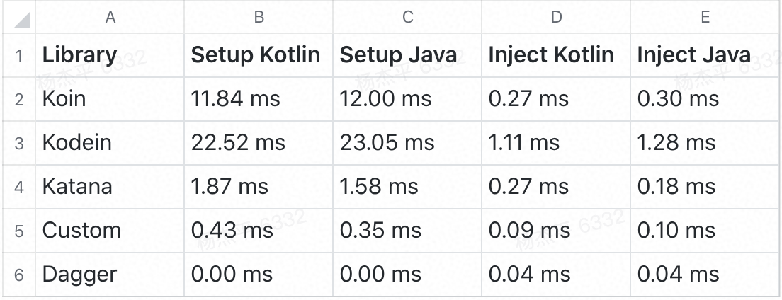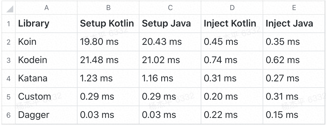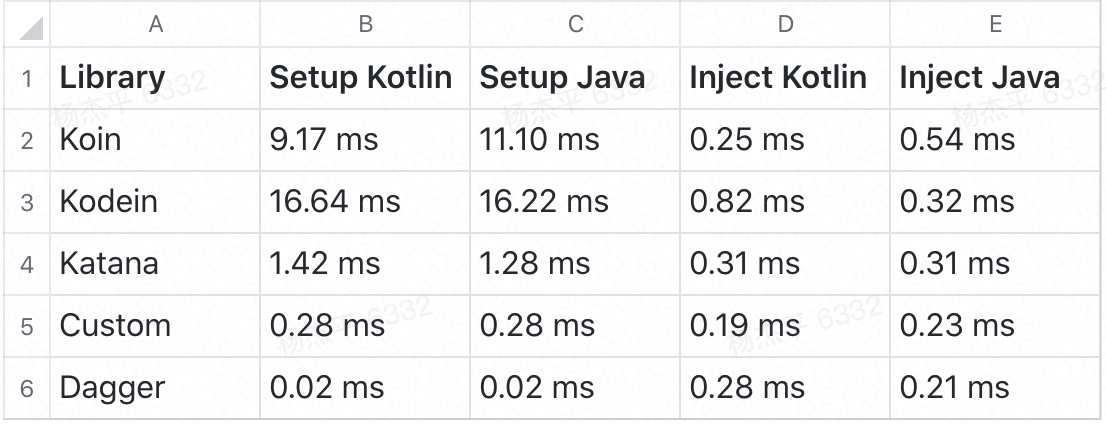 - 从上面可以看出koin框架在setup阶段会比dagger耗时,因为koin注册Moudle是通过记录每个module的类定义来实现的,因此当注册的module越多越耗时,而dagger是编译时生成注册对象的,不会占用运行时间。注入阶段由于只获取一个对象,因此两个框架相差不多