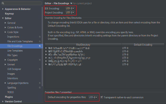 ①settings --> editor --> code style --> file encodings 中IED Encoding 和project Encoding defult encoding for properties files 三个设置为utf-8