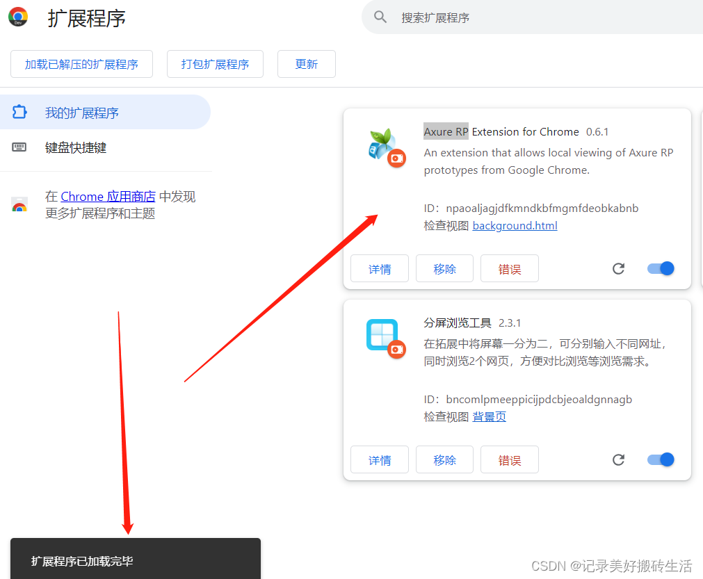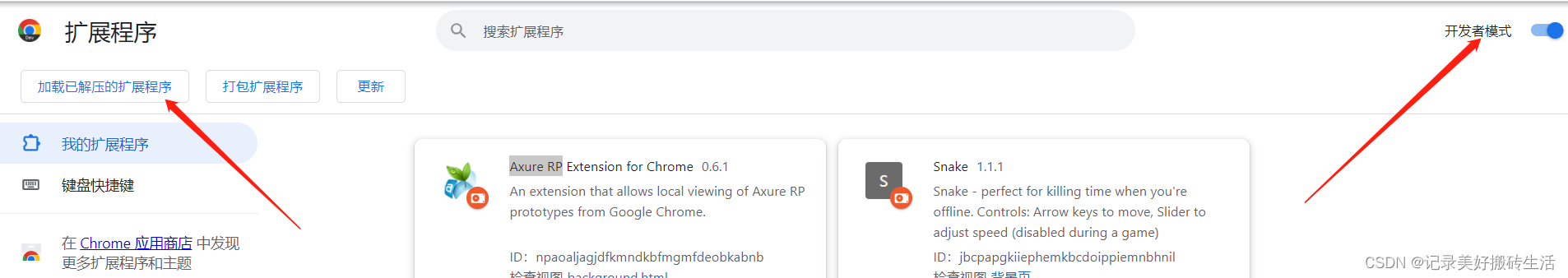 5、打开扩展程序,点击打开开发者模式、点击加载已解压的扩展程序