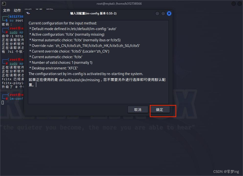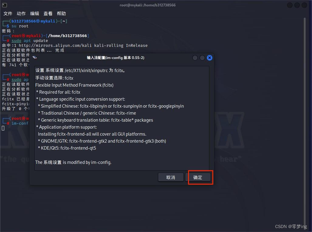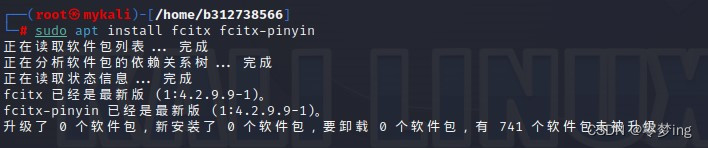1.使用命令sudo apt update和sudo apt install fcitx fcitx-pinyin安装中文输入法