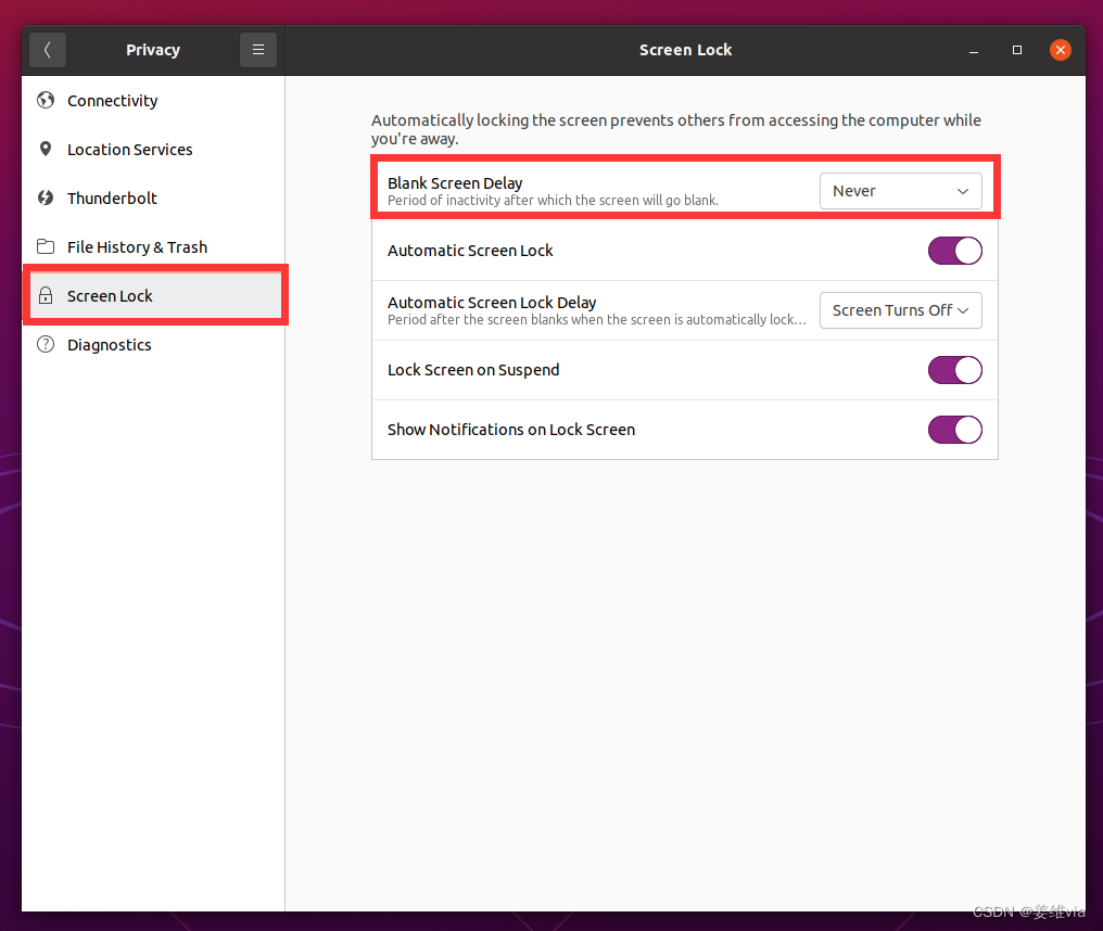 3.在screen lock(屏幕锁定)中blank screen delay(黑屏延时)调整即可