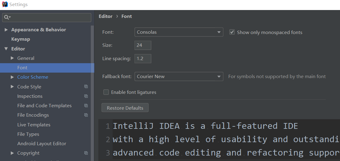 点击File——Settings——Editor——Font ,里面可以修改字体、大小、间距