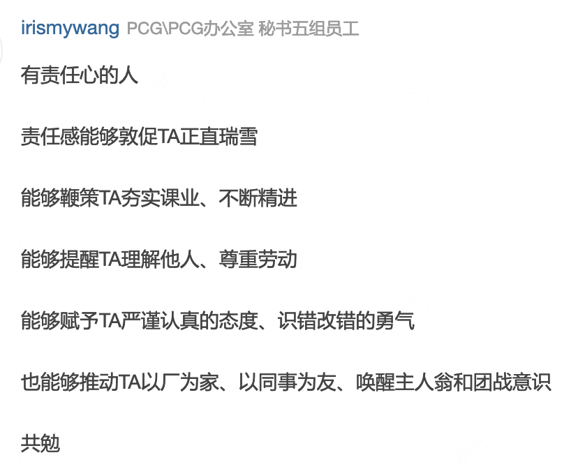 鹅厂小记者盘点了近期公司管理层的发声,也通过话题“你想和什么样的人成为同事”进行了内部意见征集,在获取的答案中,“自驱力”、“责任心”等一些关键词高频出现,“逻辑严谨性”、“思辨能力”也备受重视,甚至“实在”、“聪明”等形容词也是关注点之一。