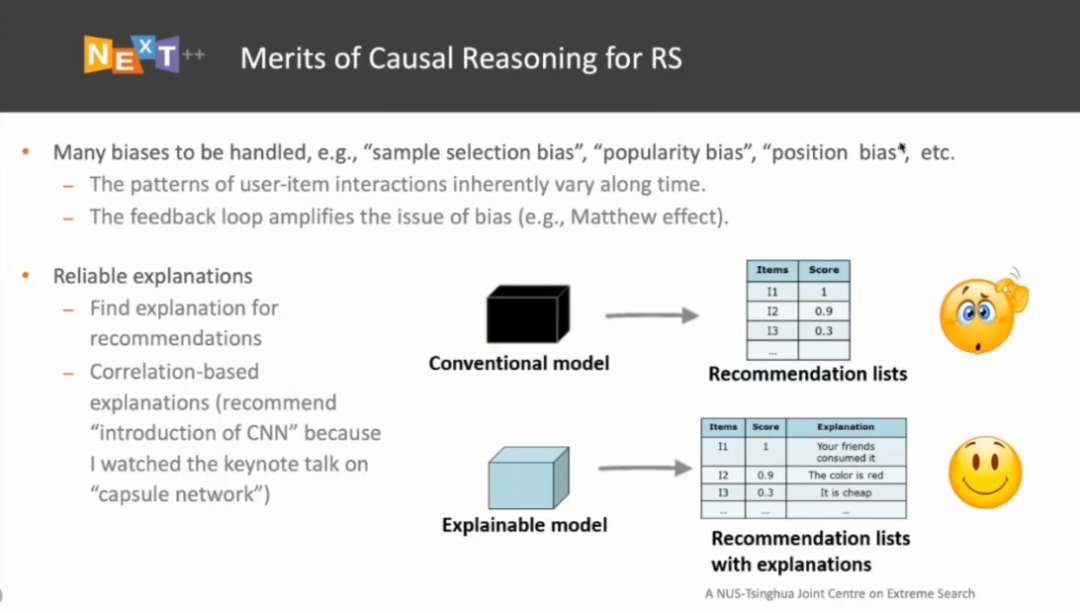 除此之外,因果还能为推荐系统带来更可靠的解释性。目前,深度学习模型大多是黑盒模型。对于为终端用户服务的模型而言,如果我们可以为其赋予可解释性,将会在很大程度上有助于提升用户对系统的信任程度。当前大多数的可解释推荐方法仍然停留在为推荐结果寻找解释的层面上,它们试图通过注意力机制或者树状结构等方式构建一个可解释模型。然而,由于我们往往基于「关联」关系搭建了推荐模型,因此这些解释结果只能够反映出一些相关性层面上的推荐原因。例如,当 YouTube 等视频网站为用户推荐了一个介绍卷积神经网络(CNN)的视频,传统方法对其的解释可能是:用户观看过 Hinton 有关「胶囊网络」(capsule network)的主题演讲(注:胶囊网络与卷积神经网络之间有关联,它们都属于神经网络模型)。然而,这种解释似乎并不合理。这是因为,观看「胶囊网络」演讲的用户一般而言对于卷积神经网络已经有所了解。如果再向此类用户推荐 CNN 的入门介绍视频,这里提供的解释是没有说服力。目前,一部分研究人员正试图基于「逆倾向指数」(IPS,Inverse Propensity Score)将因果推理引入到推荐系统的可解释性研究工作中。