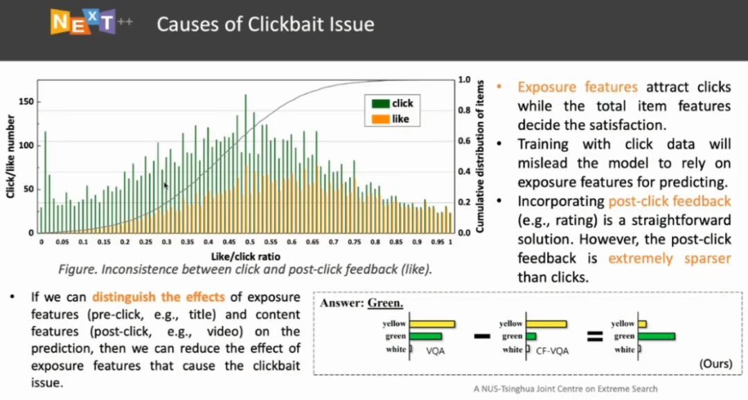 图 14 显示了「点击诱饵」对用户体验的影响。图 14 的横轴代表用户点击和用户最后是否喜欢该物料的比例。我们按照比例对点击行为进行了排序,发现用户对很多物料的点击的体验处于图的侧部分,对应于「踩」(dislike)。如果我们使用点击行为训练一个推荐系统模型,「曝光特征」(exposure features)会吸引更多的点击量,然而它并不能保证良好的用户体验。