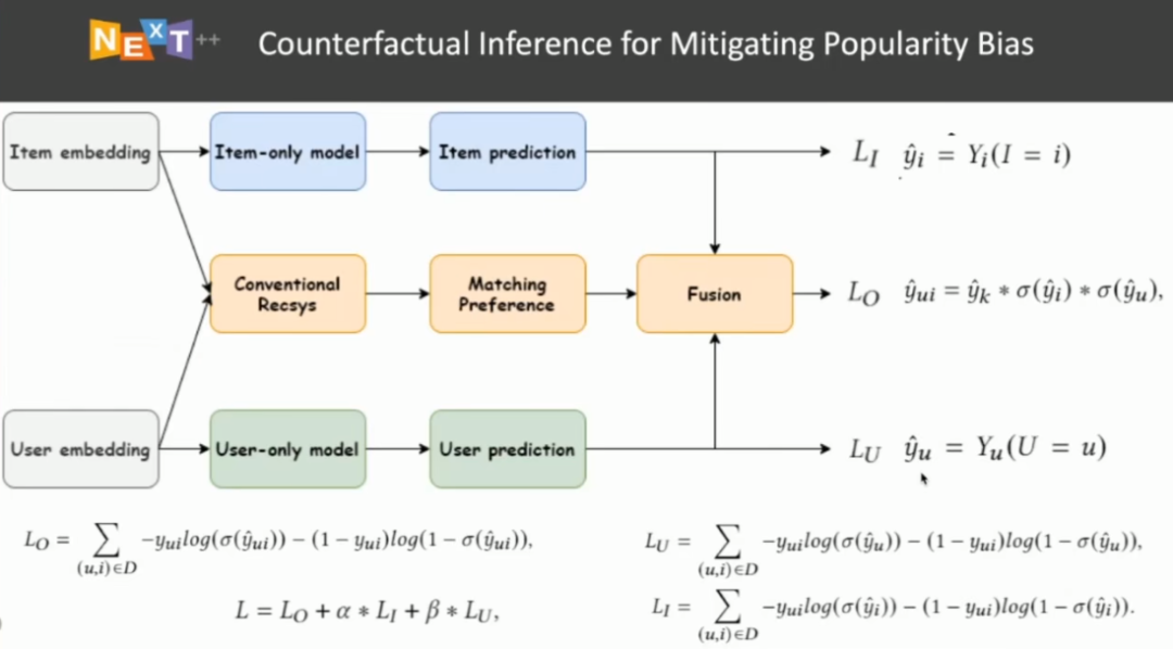 具体而言,图 11 中黄色的部分代表传统的推荐系统,该模型使用用户嵌入和物料嵌入作为输入,得到二者的匹配情况 y_k,并基于这种匹配得出推荐得分。除此之外,我们还额外引入了两项用于分别建模 U 和 I 对 R 的直接影响,将使用物料特征得到的预测结果记为 y_i,将使用用户特征得到的预测结果记为 y_u。