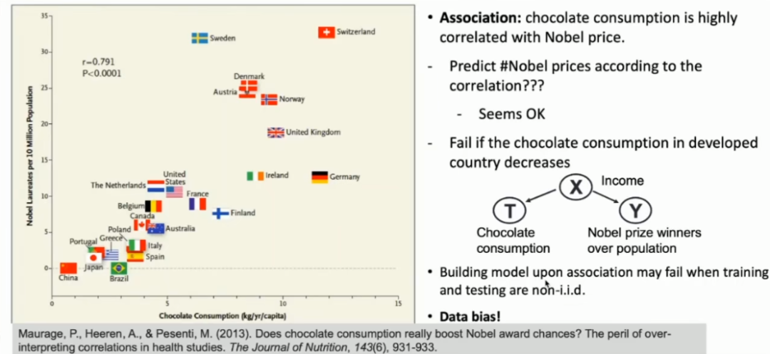 该模型为什么会失效?从数据上看,历史数据告诉我们,巧克力消费量和诺贝尔奖的获得数量是高度相关的。但是,其背后的原因可能是:在过去的几十年中,收入较高的国家对于教育、科研的投入可能更大,因此就获得了更多的诺贝尔奖。同时,收入较高的国家可能也会消费更多巧克力,所以才导致巧克力的消费量与获得诺贝尔奖的数量在表面上有高度的正相关性。然而,如果收入高的国家的国民出于健康考虑,不再吃更多巧克力,这种相关性就会产生改变。