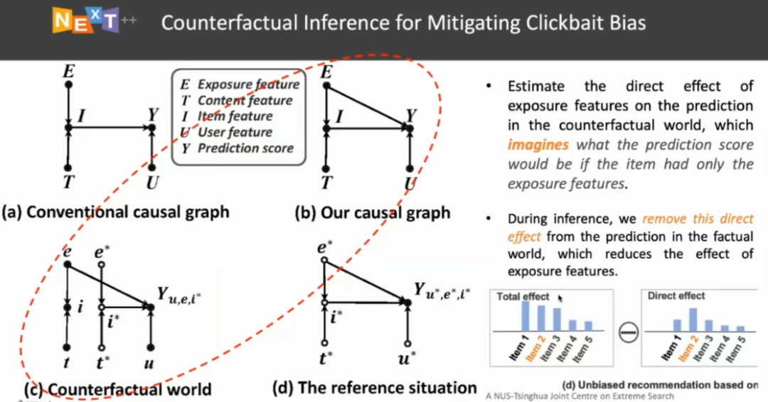 类似地,冯福利团队梳理了这一推荐过程中的因果关系,添加了曝光特征与预测得分之间直连的边,利用反事实的方法去估计曝光特征对于点击概率的贡献(即因果效应),在预测得分中减去曝光特征的贡献就可以得到相对无偏的推荐结果。例如,对于物料 2 来说,如果我们只使用曝光特征,会发现其对其点击行为的预测概率就非常高。原始的数据是有偏的,如果物料 2 存在「标题党」现象,但我们从预测得分中减去曝光特征的影响我,物料 2 的排序就会下降,从而消除了这种「点击诱饵」误差。