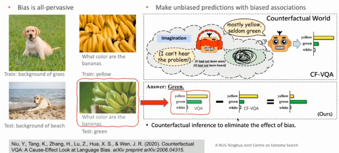 此外,在视觉问答系统(VQA)任务中,同样也存在数据偏差的问题。假设问答系统接收到的问题是:「香蕉是什么颜色的」?在我们的训练数据集中,大多数对于该问题答案都是「黄色」,即训练数据集中的香蕉都是熟透了的黄色。但是,当我们遇到一个测试用例为还未成熟的绿色香蕉图片时,很有可能 VQA 模型无法正确回答出该香蕉为绿色。这是因为在训练好的 VQA 模型看来,绝大多数训练样例对该问题的答案都是「黄色」,模型很难纠正这种「偏见」。