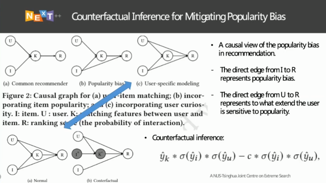 在冯福利博士的研究团队看来,上文提到的两种解决方案都试图在训练阶段解决流行度偏差问题。而简便起见,我们是否可以在使用有偏的数据训练,得到有偏的模型推荐结果的情况下,试图将带来流行度偏差的因素消除掉,从而得到无偏的推荐结果。