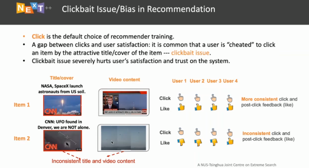除了流行度偏差,推荐系统中还存在「点击诱饵」偏差问题(即物料中存在许多「标题党」)。「点击诱饵偏差」指的是,用户可能会由于物料标题的误导而产生一些点击行为。以视频为例,某视频的标题和封面可能是令用户十分感兴趣的 UFO,而实际上当用户打开视频后,会发现视频内容与 UFO 没有关系,从而带来了非常差的用户体验。如果说我们用基于点击行为数据集去训练推荐系统模型,会经常遇到这种「点击诱饵」偏差。