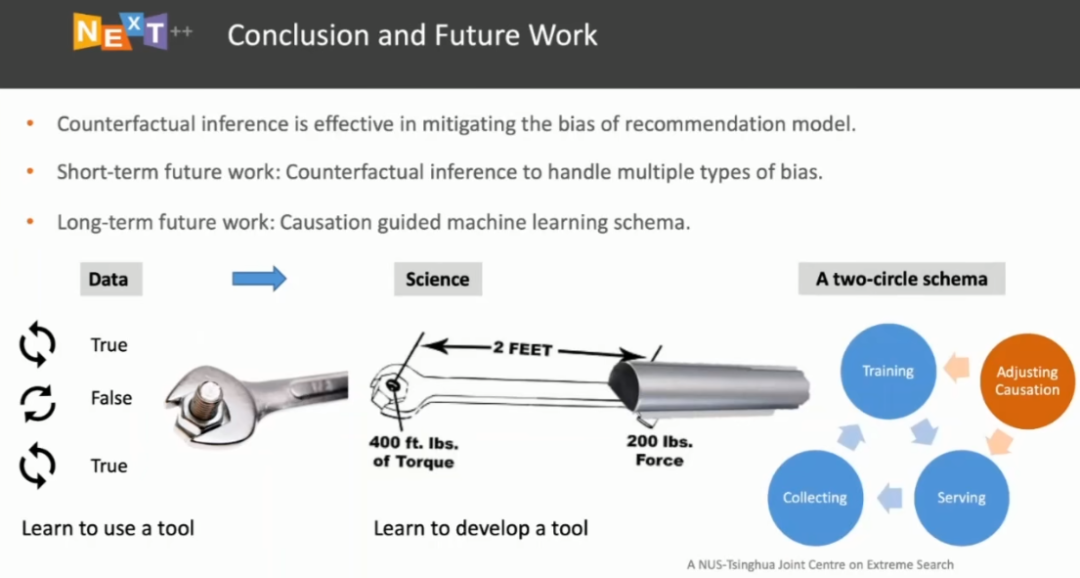 冯福利博士指出,他们当前基于反事实推理消除数据偏差的工作都是针对每一种偏差单独设计处理方法,当我们遇到多种数据偏差时,现有的模型就可能会失效。短期之内,冯福利博士团队试图同时处理多种数据偏差,在推理阶段设计一个快速的适配器,决定针对给每一位用户的特点应该更多地消除怎样的数据偏差。未来,冯福利博士团队试图搭建一种基于因果推理的机器学习模式。他们认为,机器学习研究应该经历「数据」到「科学」的发展过程。从「数据」的角度来看,如果我们想解决拧螺丝的问题,在收集大量数据后很快就能教会机器:顺时针会将螺丝拧紧,逆时针可以将螺丝拧开。但是从「科学」的角度来说,扳手之所以可以拧开螺丝是因为杠杆定理。「数据」驱动的机器学习与「科学」驱动的机器学习的区别在于:当我们遇到拧不开的螺丝时,如果知道背后科学原理是杠杆定理,我们应该想办法延长力臂,而不是盲目地在数据中进行尝试。如图 17 所示,左图表示当前的机器学习技术实际上是学习如何使用某种「工具」;而右图指的是,当我们了解了事物背后的因果关系后,就知道如何设计一个工具。