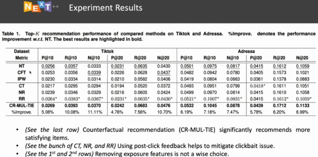 冯福利博士进行的一系列实验为我们带来了以下启发:(1)对于有偏的模型来说,只需通过简单的反事实推理操作,就可以有效实现纠偏,得到明显的性能提升。(2)引入用户在点击物料之后的反馈情况有助于消除「标题党」偏差,在反事实推理中需要考虑用反应用户体验的行为。(3)根据图 16 第一行、第二行的结果,单纯地将导致偏差的因素减掉(例如,曝光特征),并不是明智的选择,模型的性能会有所下降。这是因为曝光特征等因素还是可以在一定程度上反映出用户的兴趣。