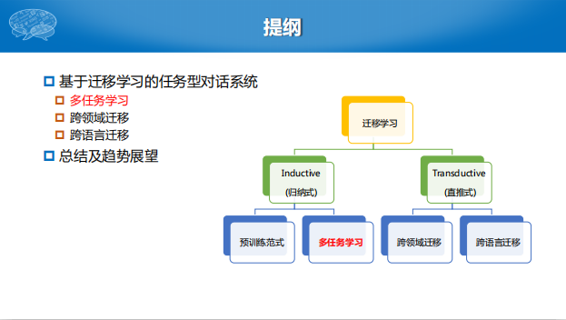 在车万翔教授的报告《基于迁移学习的任务型对话系统研究》中,他针对任务型对话场景,指出目前深度学习技术所要求的大量高质量标注数据无法满足,并试图通过迁移学习的方法,将利用源任务训练的模型学习到的知识迁移到目标任务上,从而在目标任务上获得较好的模型性能。具体而言,车万翔教授从多任务学习、跨领域迁移学习、跨语言迁移学习三个角度分别介绍了他们在该方向的研究工作。