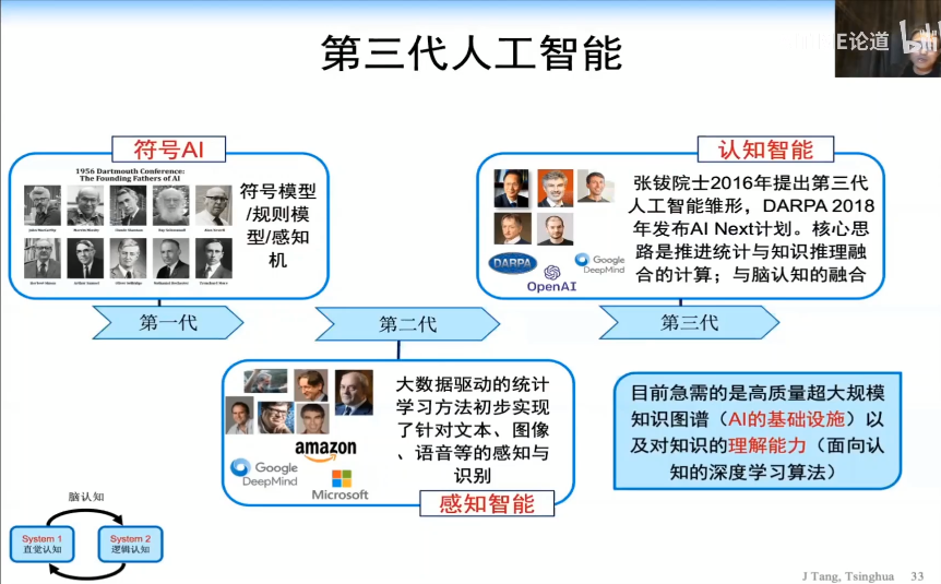 本次学术沙龙的主席、国家杰青、清华大学计算机系唐杰教授首先带来了题为《认知推理——人工智能的下一个浪潮》的主题报告,指出如今人工智能领域的研究正处于从「感知」走向「认知」的重要转型时期,这一思想也始终贯穿于本次学术沙龙各位各位讲者的精彩报告中。