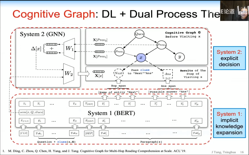 在本次演讲中,唐杰教授首先从多跳问答系统引入,回顾了面对较为复杂的问题时,人脑会采取迭代式的的认知推理过程,并将这一过程与基于预训练语言模型的「黑盒」机器学习方法进行了对比,说明现有的人工智能技术存在「缺乏可解释性」的弊端,从而指出了将外部知识与概念融入到机器学习模型中的重要性。