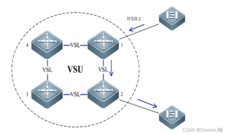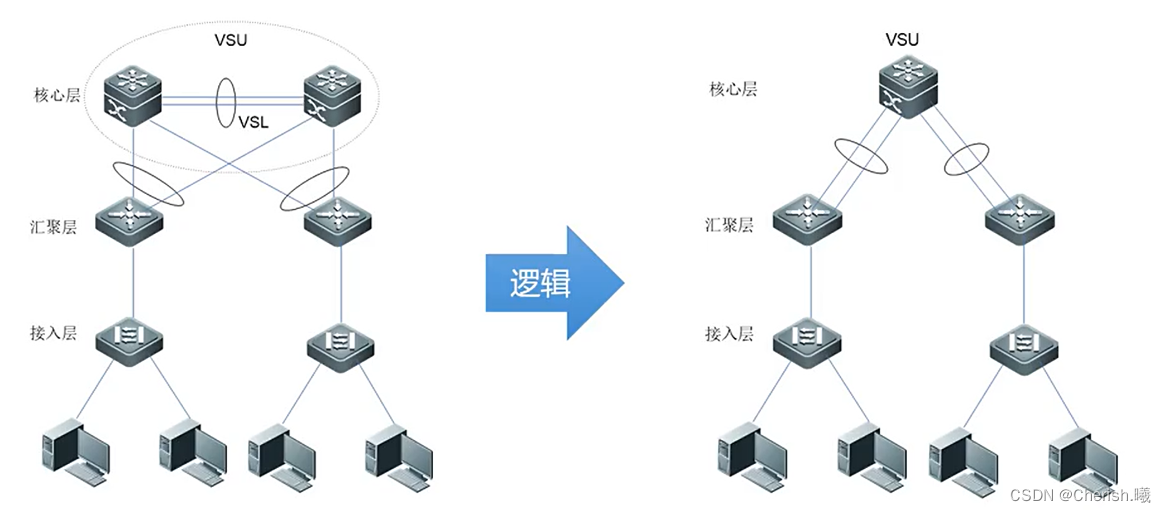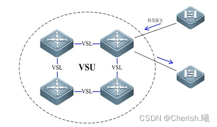VSU ( Virtual Switch Unit ),一种把两台物理交换机组合成一台虚拟交换机的新技术如下图把传统网络中两台核心层交换机用VSU替换,VSU和汇聚层交换机通过聚合链路连接。在外围设备看来,VSU相当于一台交换机 。