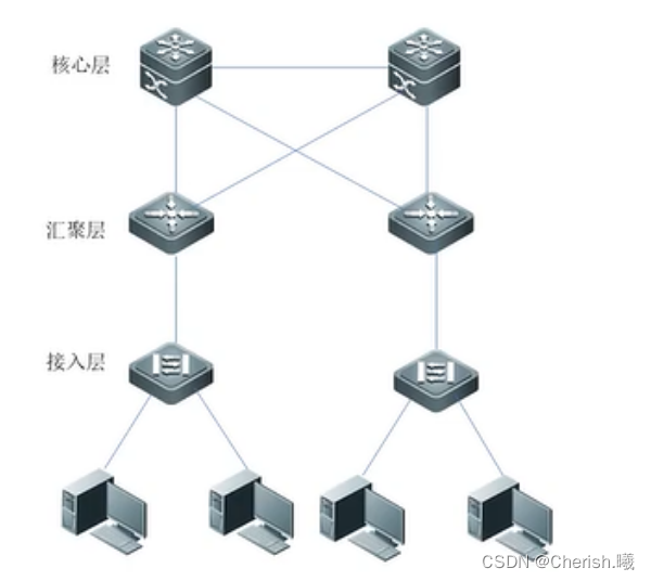 传统网络中,为了增强网络的可靠性,在核心层部署两台交换机,分别连接所有汇聚层交换机。